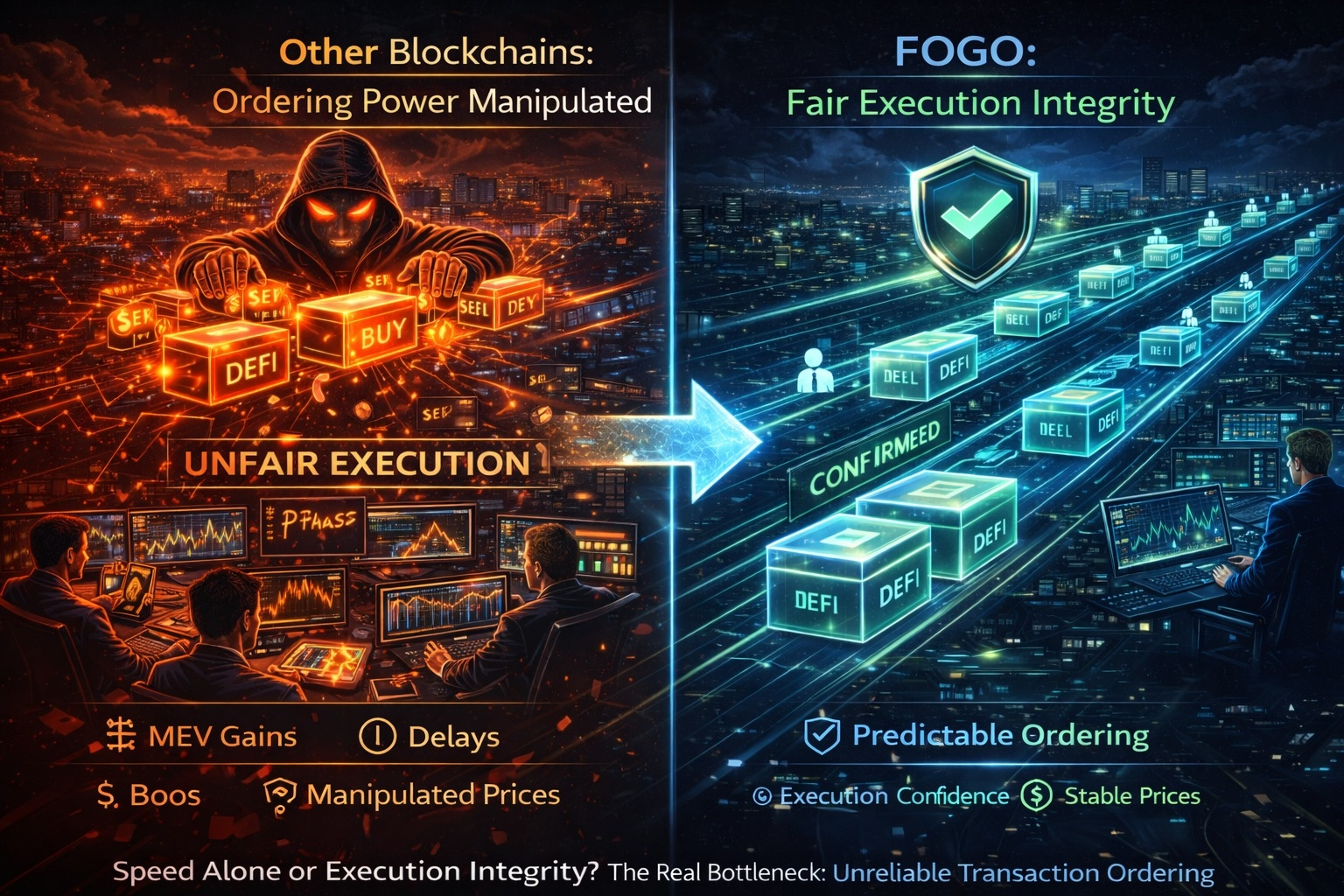 Most people think crypto’s main problem is speed. They see gas fees spike, watch transactions stall, and figure the issue must be throughput. But if you actually sit down and watch trading or onchain activity during those wild, volatile moments, you notice something else going on. It’s not just that transactions show up late—they show up out of order, the prices don’t line up, and what you get often feels off from what you intended. The network’s moving, but the whole experience doesn’t feel fair. That’s the real bottleneck in crypto right now. Not just how much stuff the system can handle, but how well it actually executes your intent. On paper, blockchains brag about speed—thousands of transactions per second, fast blocks, cheap fees. But users still run into slippage, sandwich attacks, weird fills, and random priority changes. Technically, everything’s working, but the actual experience feels warped. It’s not just about who pays the most or who gets in first. It’s about who can mess with the order, hide their transactions, or game validator incentives. This is where the real problem hides: ordering power. In most blockchains, your transaction goes into a public waiting room. Validators or block builders decide who gets in first—and that order is valuable. So a whole side economy has popped up, built around extracting profit from how transactions are sequenced. People call it MEV, which makes it sound like a technical edge case. But honestly, it’s more like a hidden tax. You send your intent to the network, and someone else gets to twist it for their own gain. It’s everywhere, even if you don’t see it. Traders end up paying more than they wanted. Liquidations happen sooner than they should. DeFi trades don’t land at the quoted price. The network’s fast, but execution is messy. So here’s the bigger question: Blockchains are supposed to be neutral. Why does transaction order feel like some private auction? Most of the conversation around scaling is about making the road wider—more throughput, faster blocks, more parallel stuff. But if the rules let certain players cut in line for profit, then adding more lanes just makes the race crazier, not fairer. It might even make things worse. That’s where Fogo comes in. Instead of chasing speed records, Fogo zeroes in on execution integrity. The idea’s pretty simple but goes deep: if you make transaction ordering predictable, there’s less value to extract, and users get better outcomes. Instead of shrugging off MEV as “just how things work,” Fogo treats it as a design flaw to fix. Sure, Fogo wants to be fast and consistent on the surface. But under the hood, the whole system is built to cut down on the chances for people to mess with transactions between when you hit send and when your trade goes through. The goal isn’t just low latency—it’s low distortion. Think of it this way: speed is like a stopwatch, but fair ordering is like a ruler. Speed tells you how quickly the transaction lands. Fair ordering tells you how close the result matches what you actually wanted. Fogo’s whole approach is about tighter coordination between when they take in transactions and how they build blocks. That shrinks the window where people can play games with the order. If you can’t secretly reshuffle transactions for profit, the incentives shift—less extraction, more focus on validating honestly. And if this works, it unlocks something crypto rarely talks about: execution confidence. For traders, it means less sneaky slippage. For DeFi protocols, more reliable liquidations and fair prices. For builders, it’s a base layer where outcomes depend on the market, not on invisible middlemen. The impact is subtle, but it matters. When users actually trust execution, they trade harder, provide more liquidity, and stop obsessing about slippage or overcollateralizing just to feel safe. Over time, that makes capital flow better across the whole ecosystem.