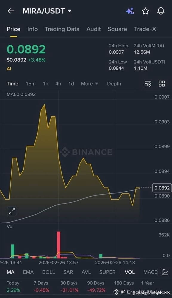 short latest price & technical snapshot of $MIRA /USDT on 28 Feb (Binance) based on recent market data and trader posts: