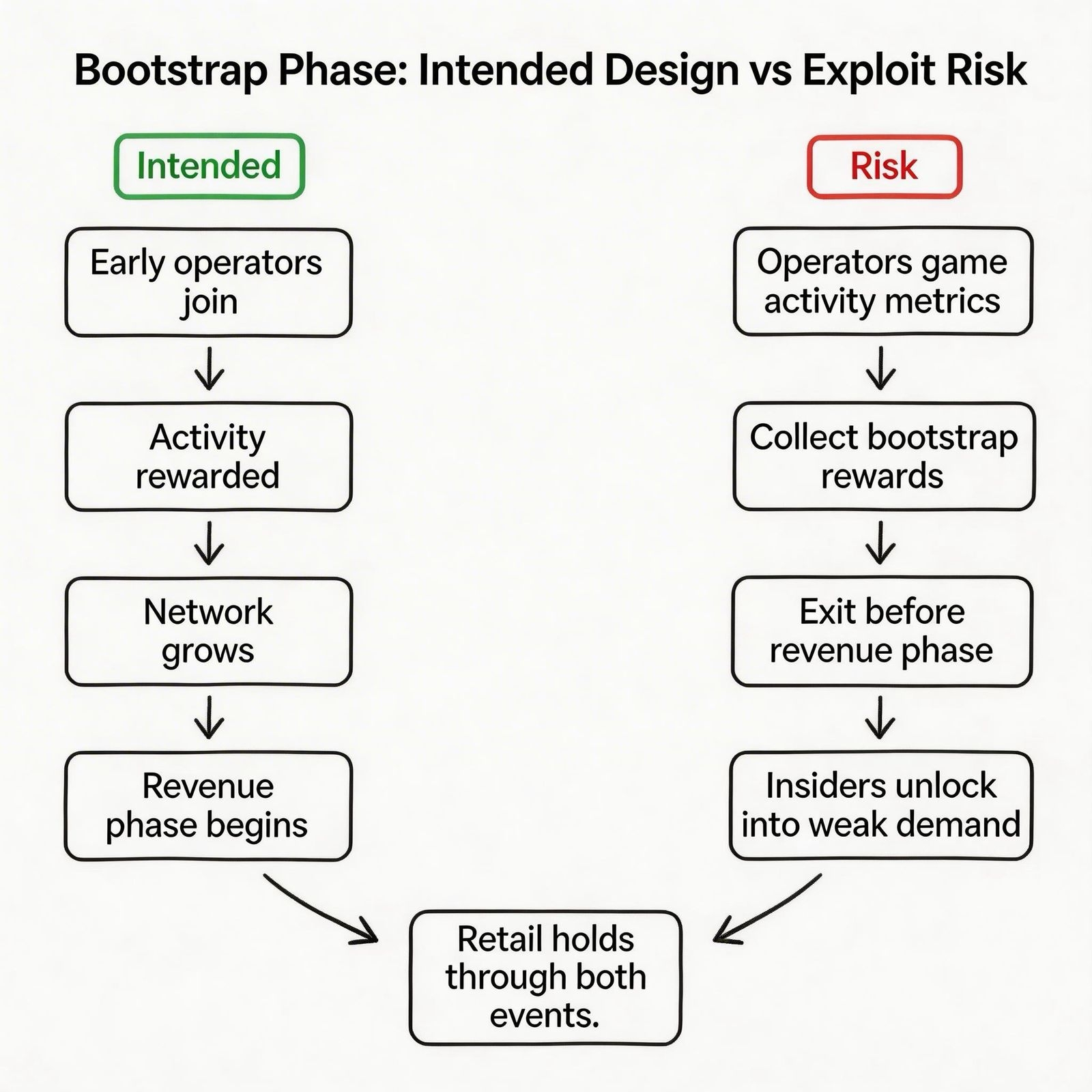 mechanism: early operators game activity metrics, collect bootstrap rewards, exit before revenue phase. insiders unlock month 12 into network that looks active but isn't generating real output. retail holds through both.