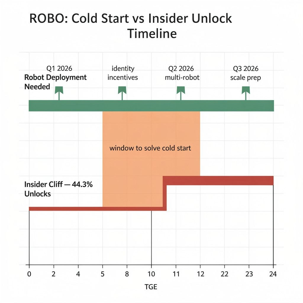 44.3% insider allocation. 12-month cliff. insiders unlock February 2027. by that date network either has real robot activity or it doesn't. if it doesn't, 44.3% supply starts moving into market with theoretical demand and real sell pressure.