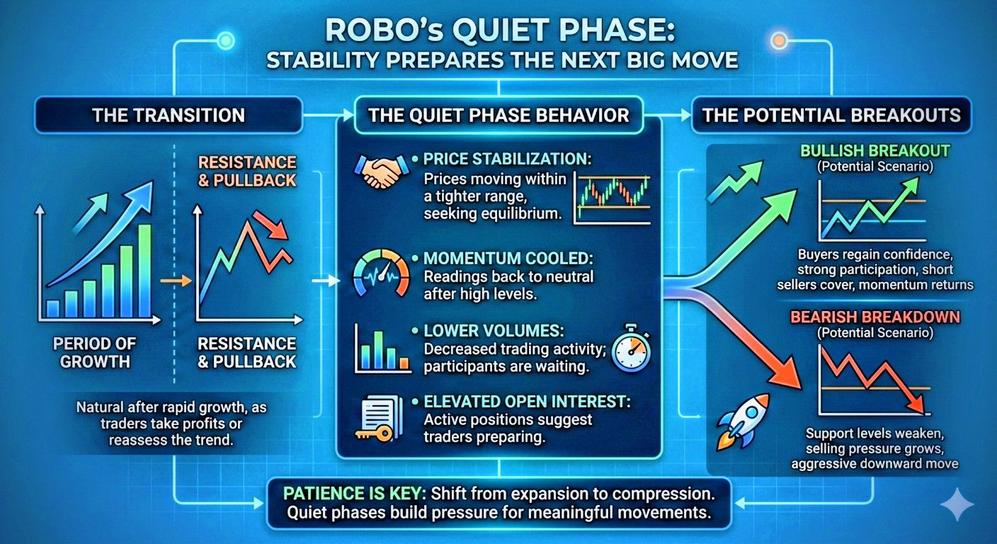 Financial markets rarely follow a perfectly straight path. Periods of excitement and rapid growth are often followed by moments of calm where prices move within a narrower range. These quieter periods may look uneventful on the surface, but they often hold important clues about what might happen next. Recently, $ROBO has entered exactly this type of phase.