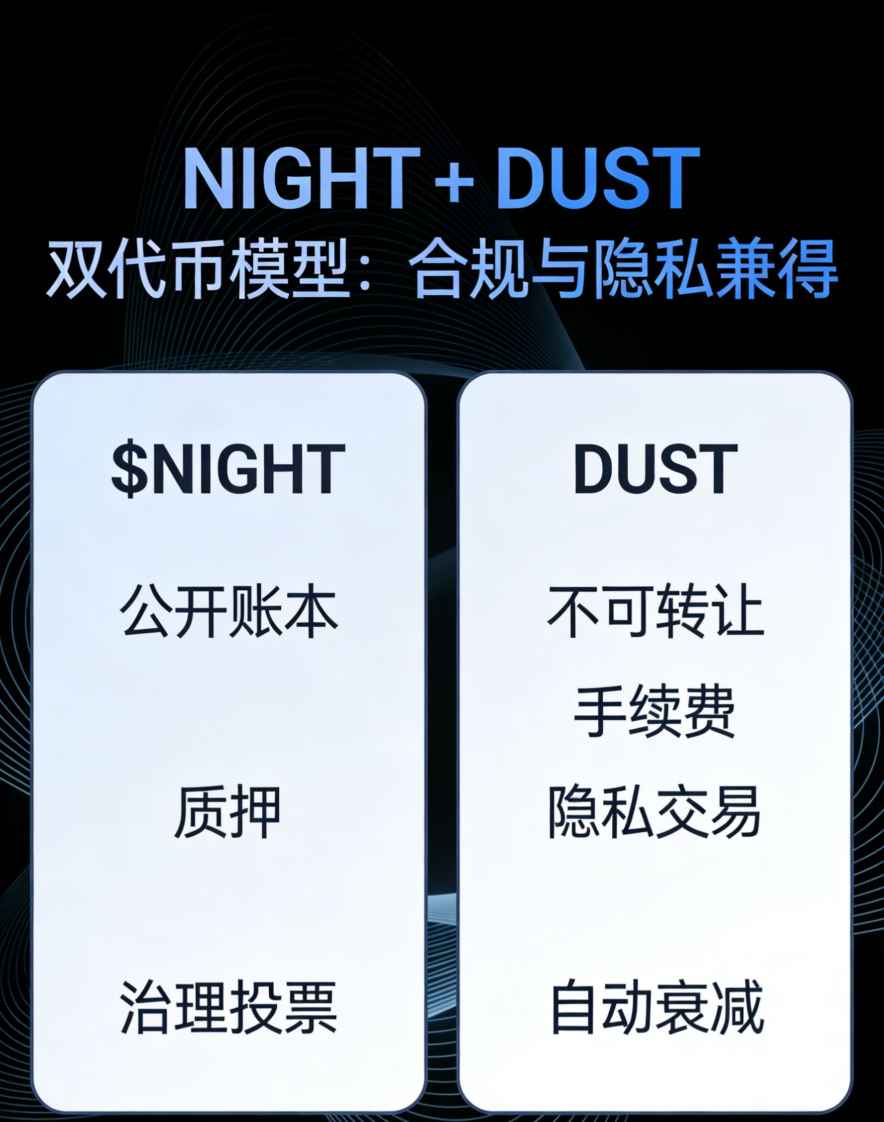 Đây là “nhiên liệu” cho mạng lưới hoạt động. Người dùng nắm giữ $NIGHT có thể tạo ra DUST, dùng để thanh toán phí giao dịch hoặc kích hoạt chức năng bảo mật. Có một thiết kế đặc biệt thông minh: DUST không thể chuyển nhượng và sẽ tự nhiên suy giảm theo thời gian. Điều này tránh việc các nhà đầu tư lớn độc quyền tích trữ tài nguyên, đảm bảo phân phối tài nguyên mạng một cách công bằng và phát triển bền vững.