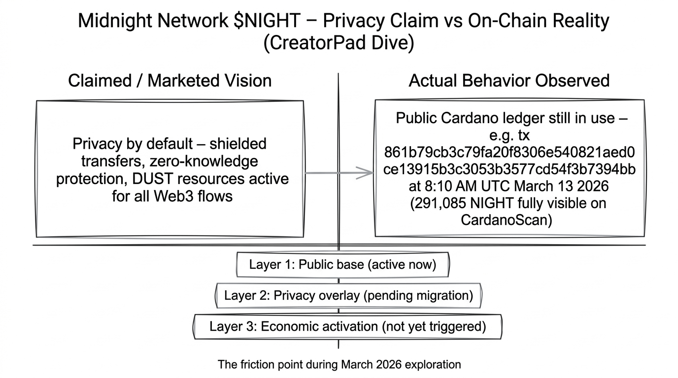 While digging through Midnight Network’s mechanics for the CreatorPad task, I paused at one simple transfer that hit at 8:10 AM on March 13, 2026. The hash 861b79cb3c79fa20f8306e540821aed0ce13915b3c3053b3577cd54f3b7394bb sits right there on CardanoScan for anyone to see — 291,085 NIGHT moved between two addresses, ADA fee paid, everything wide open. No shielding, no zero-knowledge veil, just plain public ledger activity on the Hilo phase. That single on-chain moment made the whole “privacy-first” narrative feel suddenly concrete, because Midnight Network $NIGHT #night @MidnightNetwork keeps promising infrastructure that protects data by default, yet here we are, still routing token flows through Cardano’s transparent rails.