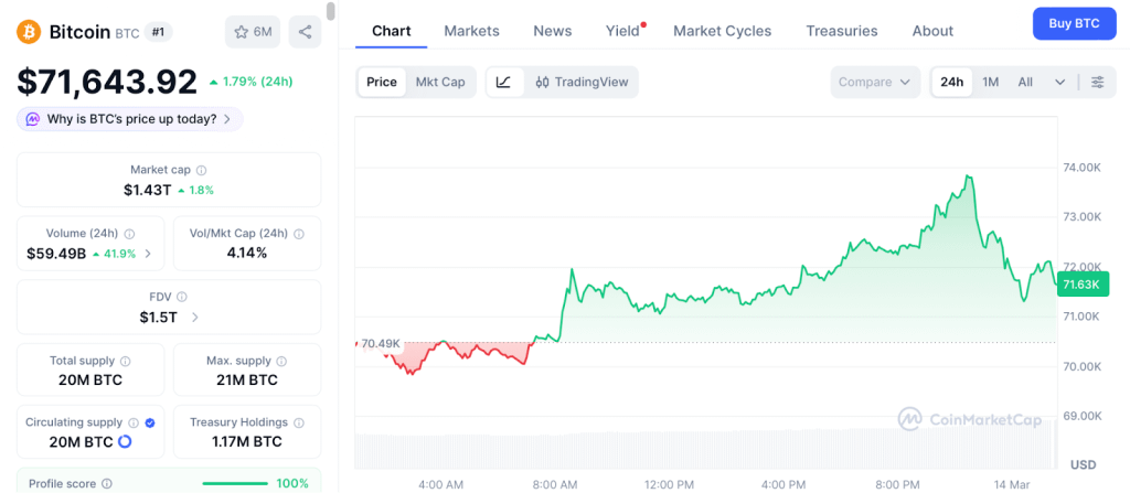 BTC đã tăng lên $71,643 theo CoinMarketCap và ngưỡng kháng cự $74,500 là rào cản cuối cùng trước khi mở không gian lên $80,000. Dòng tiền ETF đạt $568 triệu xác nhận nhu cầu từ các tổ chức, và các nhà phân tích duy trì mục tiêu trên $100,000 vào giữa năm 2026.