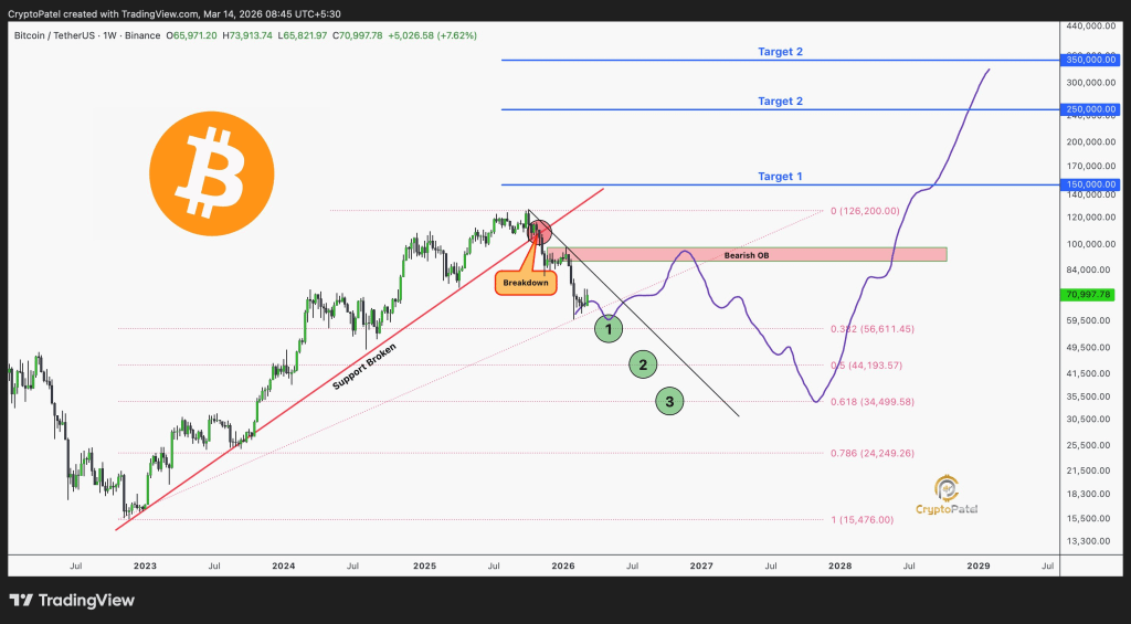Crypto Patel cũng phác thảo ba mục tiêu dài hạn có thể định nghĩa chu kỳ bò tiếp theo nếu Bitcoin cuối cùng phục hồi từ sự điều chỉnh hiện tại. Mục tiêu đầu tiên xuất hiện gần $150,000. Mức này đại diện cho một mở rộng khiêm tốn vượt qua mức cao nhất mọi thời đại trước đó.