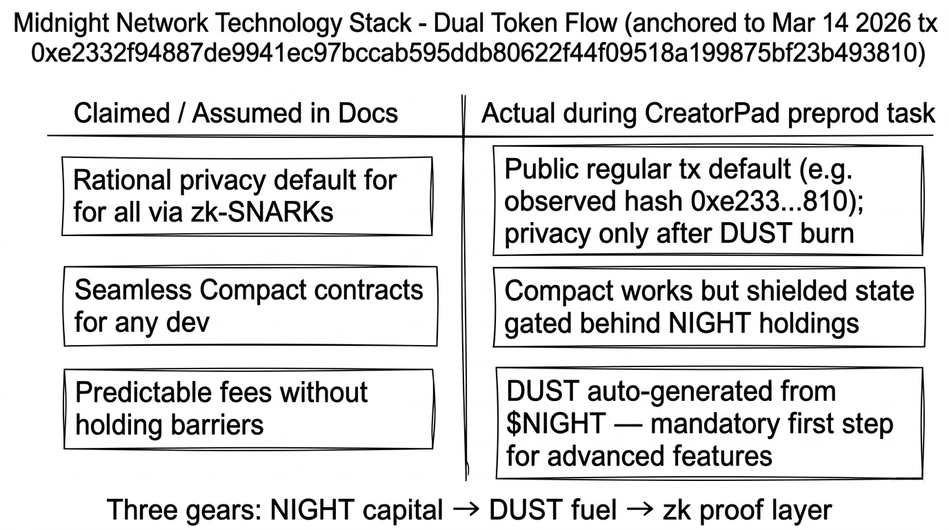 The contrast hit hard because the docs frame the tech as seamless rational privacy for everyone. In practice the stack forces you to commit $NIGHT holdings first to generate the DUST resource that actually powers shielded execution. My test stayed transparent — metadata, amounts, everything — until that burn step. It felt less like a privacy coin and more like a deliberate two-layer machine.