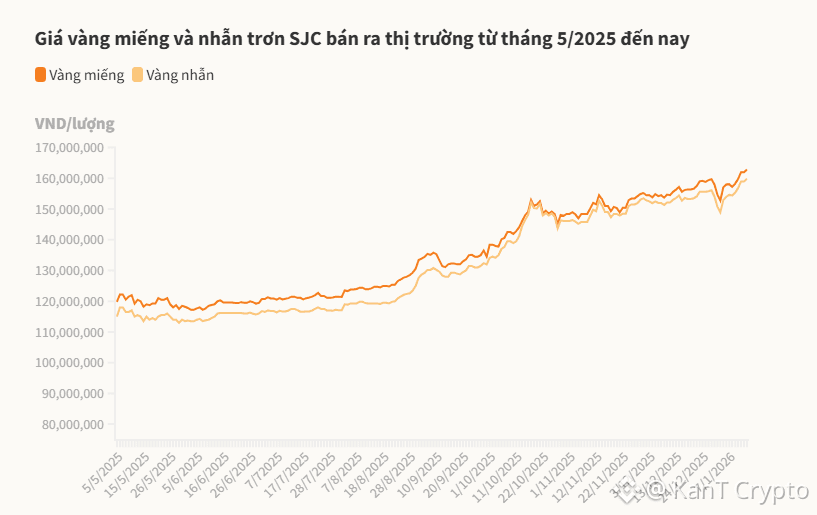 Nhẫn tròn trơn cũng có mức tăng tương tự, lên sát 160 triệu đồng một lượng. Tại SJC, loại vàng này quanh 157,4 - 159,9 triệu. PNJ, Doji giao dịch vàng nhẫn trơn dao động 157 - 160 triệu, còn Bảo Tín Minh Châu là 159 - 162,9 triệu đồng một lượng - cao nhất trong các thương hiệu.