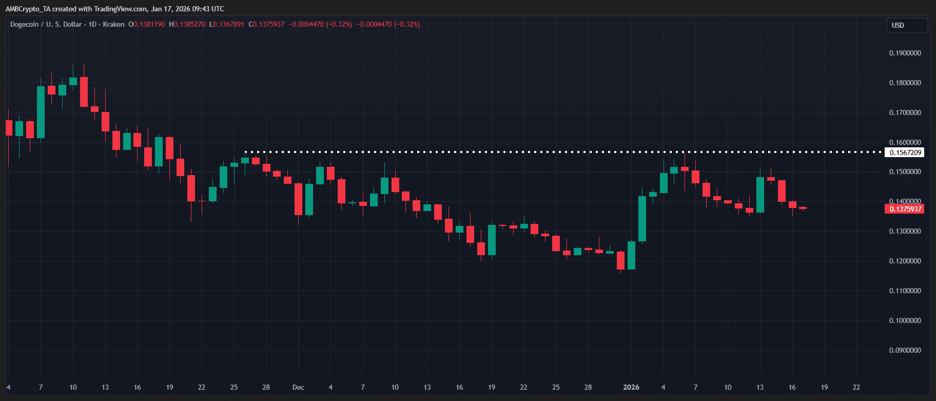 🔸 Về mặt kỹ thuật, DOGE đã không thể vượt qua ngưỡng kháng cự $0.15 bốn lần kể từ giữa tháng 11 năm 2025. Do đó, 5 tỷ đô la trong vốn hóa thị trường đã bốc hơi khi giá giảm 14% từ mức cao nhất của nó.