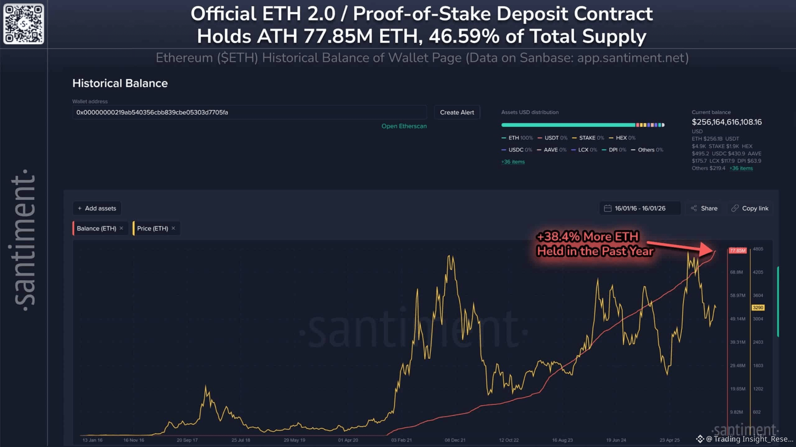 $ETH vừa đạt cột mốc lịch sử: 46.59% tổng nguồn cung (77.85 triệu ETH, trị giá ~256 Tỷ USD) hiện đã bị khóa trong hợp đồng staking. Sự thay đổi cấu trúc này đang tái định hình hồ sơ khan hiếm và hành vi giá của ETH.